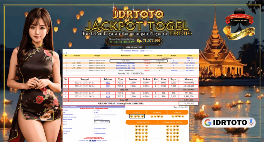 IDRTOTO BAYAR LUNAS JACKPOT PERMAINAN TOGEL CAMBODIA POOLS Rp.71.577.000 – LUNAS