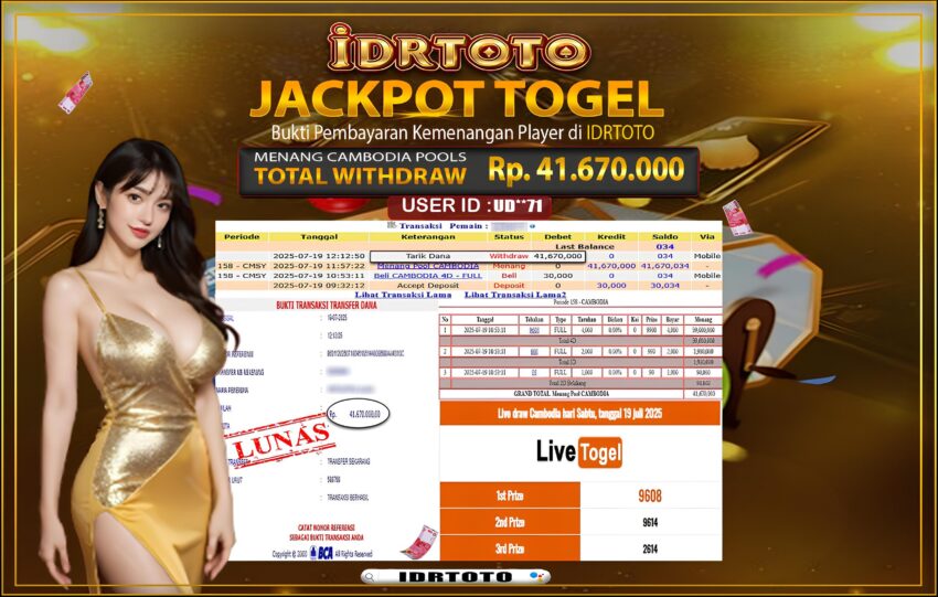 IDRTOTO BAYAR LUNAS JACKPOT TOGEL CAMBODIA POOLS Rp.41.670.,000 – LUNAS