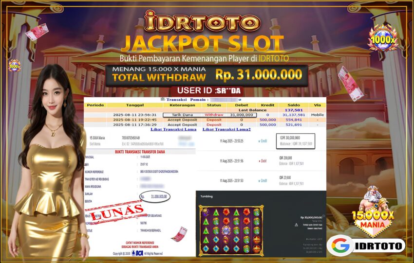 IDRTOTO BAYAR LUNAS SLOT 15.000 X MANIA Rp.31.000.,000 – LUNAS