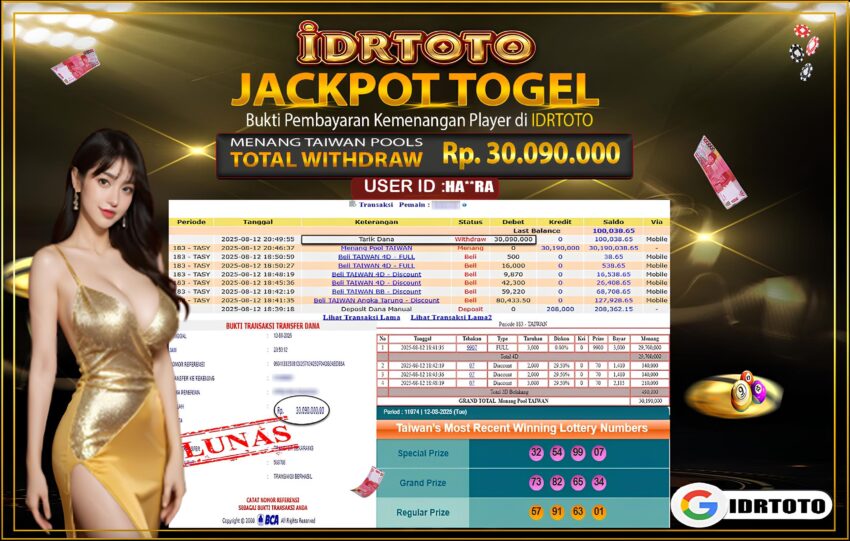 IDRTOTO BAYAR LUNAS TOGEL TAIWAN POOLS Rp.30.090.,000 – LUNAS